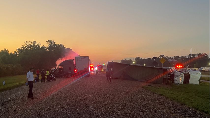 4 injured after gravel truck overturns, vehicle catches fire; I-10 reopens near Lobdell Highway
