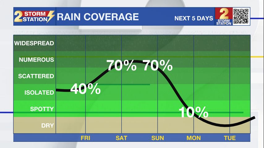 Today and tonight: Friday will feature a mix of sun and clouds with highs climbing into the low to mid 80s. Rain coverage will be lower than the past few days, but a few isolated showers and thunderstorms will still be possible during the afternoon and early evening. Most areas will stay dry, and any storms that do develop should be brief.