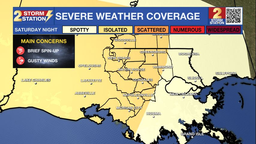 Tonight & Tomorrow: Clouds will stay in the mix tonight. Patchy fog is expected to develop from the coast inland toward the I-10/12 corridor close to dawn as lows stop in the low 60s. Saturday is a big one for the Red Stick. Between Valentine’s Day dates, LSU Baseball’s opening weekend against Milwaukee, and the Spanish Town Mardi Gras Parade, there is a lot happening outdoors. Not to be outdone, the weather will have a lot happening too, as a strong storm system is expected to cross the region between the Mississippi River and I-55 between 11 pm and 5 am. The biggest concern for the Capital Area will be damaging wind gusts and frequent lightning. While the risk is lower, we also cannot rule out a brief, "spin-up" tornado within the line of storms. Make sure floats and throws are secured and stored before bed Saturday night.