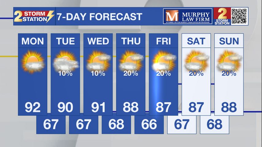 The next couple of days remain hot and dry, though some cloudiness may pass through Tuesday, which could shave a degree or two off afternoon highs. By mid to late week, changes arrive. A coastal disturbance could bring scattered showers and storms. Cloud cover will also knock highs down several degrees by Friday. Uncertain if showers will continue into the weekend.