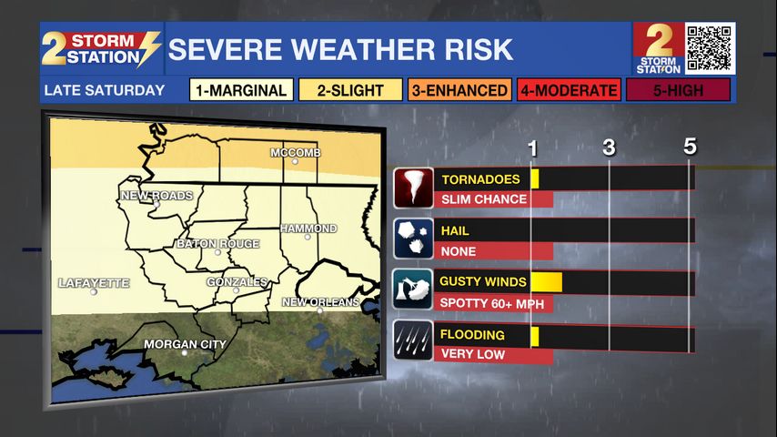 By late afternoon, a few isolated showers could pop up, which could affect Southern’s homecoming, but the main event arrives later tonight. A cold front will sweep across south Louisiana overnight, bringing a line of thunderstorms capable of damaging winds and a few isolated tornadoes. The most likely window for severe weather will be overnight, into the very early morning hours of Sunday. While flooding isn’t expected, some brief heavy rain and gusty winds are likely as storms move through.