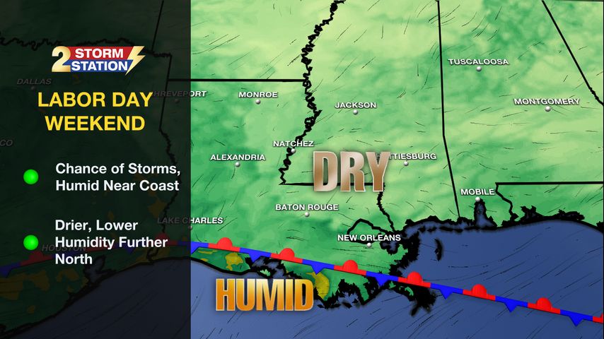 Labor Day Weekend: Most storms that did form today, will begin to dissipate overnight. Expect lows near 72 degrees under partly cloudy skies. The stalled front that has been draped across the area the last few days will be situated close to the coast on Sunday. This boundary is the dividing line between moist and dry air. Given the expected position of the front, most across the area will stay dry, with some even receiving lower humidity. Down closer to the coast, humid conditions and the chance for storms will remain. Highs will top out near 90 degrees under partly sunny skies. Nearly the exact same pattern will take place on Labor Day, meaning outside plans will be good to go!