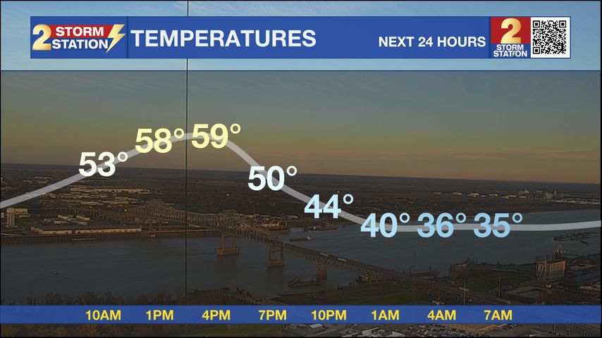 By tonight, winds gradually ease, allowing temperatures to fall quickly after sunset. Lows drop into the mid-30s in the metro, with temperatures near freezing for a couple of hours north of the I-10/12 corridor.