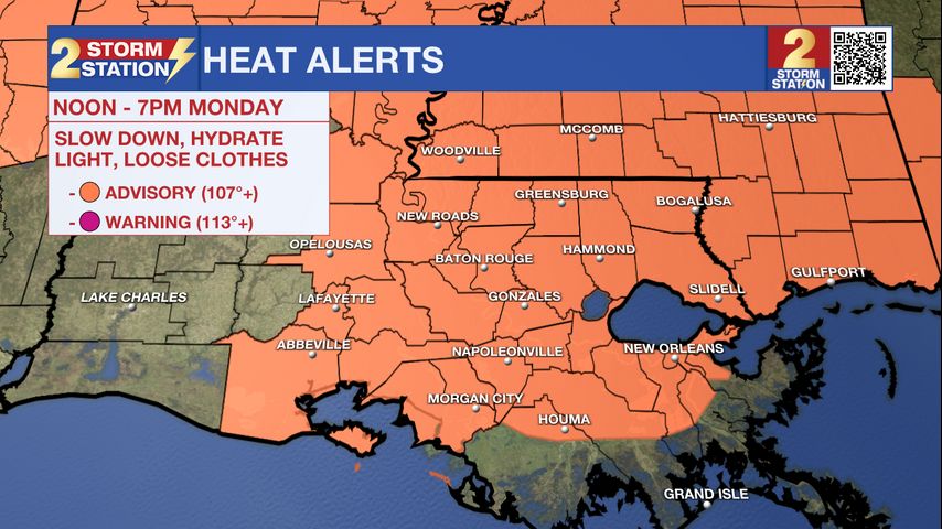 The second Heat Advisory of 2024 goes into effect on Monday. As highs soar into the middle and upper-90s, feels-like temperatures will be in the ballpark of 108-110°. Be sure to stay hydrated and be mindful of the signs of heat exhaustion and heat stroke.