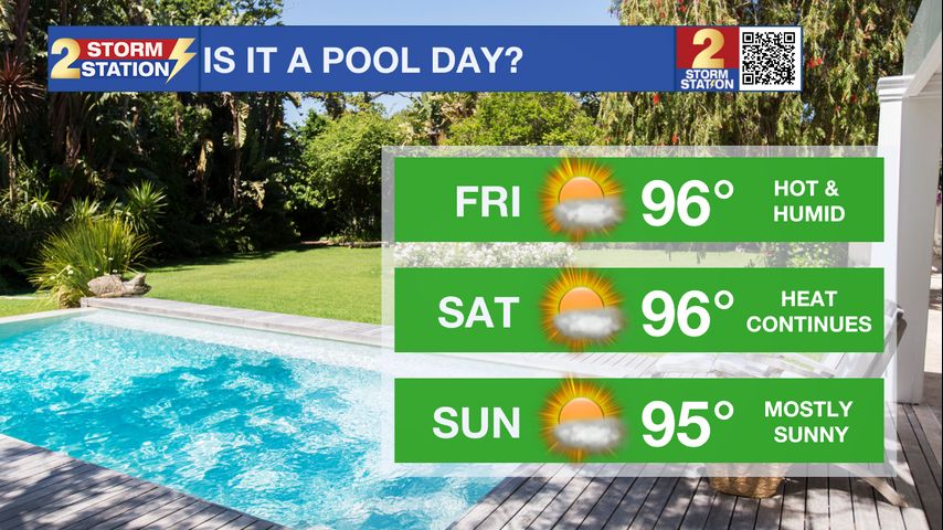 Up Next: A "heat dome" in the upper-atmosphere will build into the area over the weekend. This will allow the warm temperatures to remain in place and suppress shower development. Look for highs in the mid-90s all weekend with even higher feels-like values. It'll be a great weekend to head to the local pool. Drink plenty of water and don't forget the sunscreen!