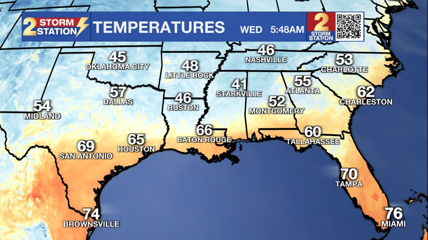 Today & Tonight: Temperatures so far this morning have been well above average. The cooler air is lagging behind the front that passed yesterday. While we are in the mid-60s, north Louisiana is in the 40s! During the day, expect mostly sunny skies, no humidity, and highs in the lower 80s. Overnight, the cooler temperatures will arrive. Lows will dip down into the lower 50s, with some locations in the 40s! Long-sleeves are advised if heading out early in the morning.