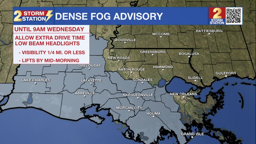 A DENSE FOG ADVISORY has been issued for areas south and southwest of Baton Rouge until 9am. Low visibility could make driving conditions hazardous. Slow down, use your low beam headlights, and leave plenty of distance ahead of you.