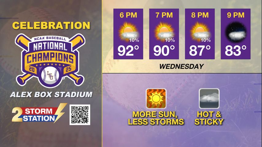 With a mid-week decline in afternoon radar activity expected, temperatures will climb a couple of degrees. For those heading to the LSU Baseball Celebration Wednesday evening, prepare for the heat by wearing loose clothing and drinking plenty of fluids.