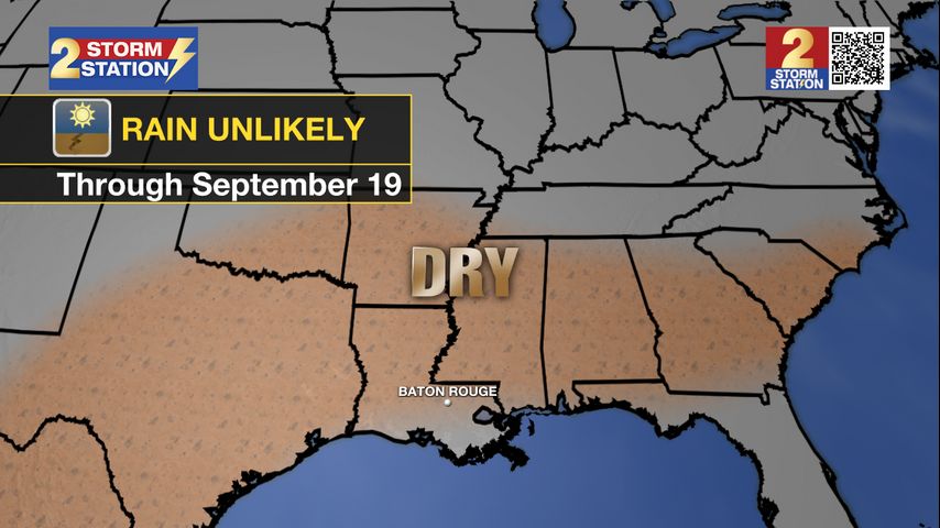 Up Next: Sprinklers will get plenty of action in the next week as sunshine and heat take over. With highs climbing into the mid-90s by the weekend, plan for hot afternoons if headed to after-work or school events. Tailgaters heading to LSU’s campus for the SEC opener Saturday should expect the same setup. Temperatures will fall through the 80s on most evenings, with overnight lows bottoming out in the upper 60s and lower 70s. While noticeable, humidity will not be at summertime levels. That will help mornings and evenings feel slightly more tolerable.